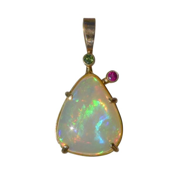 eleganter Unikat- Anhänger in gewölbter Form, mit prächtigem Farbenspiel von Gelb über Grün bis Orange. 1 Rubin und ein grüner Diamant zieren die Zargenfassung in 585 Gold